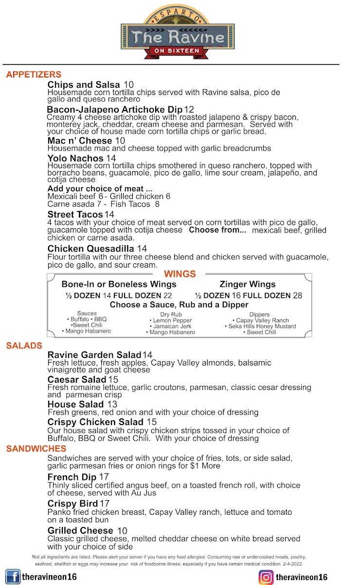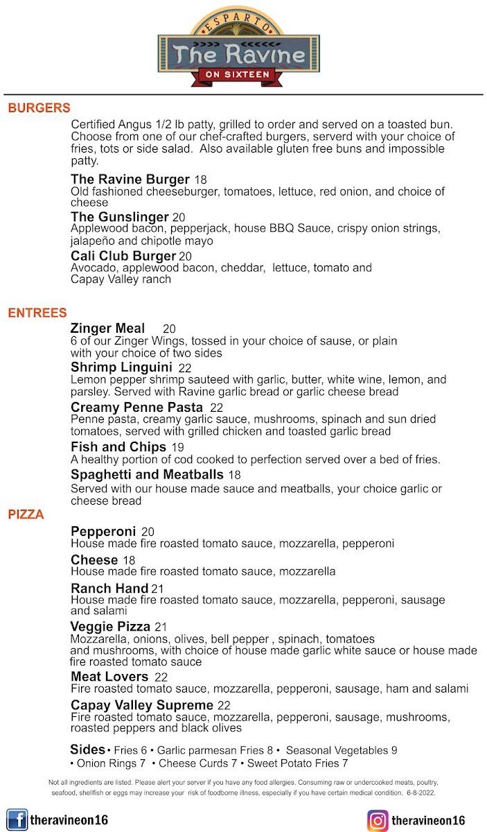 The menu at The Ravine On Sixteen in Esparto offers a diverse selection of dishes, perfect for any craving. For appetizers, you can start with Chips and Salsa, the indulgent Bacon-Jalapeno Artichoke Dip, or the comforting Mac N' Cheese Yolo Nachos. If you're in the mood for something light, the Ravine Garden Salad and Caesar Salad are great options, while the Crispy Chicken Salad adds a heartier choice to the mix. For a more savory bite, the French Dip and Street Tacos stand out. The wing selection includes both Bone-In or Boneless Wings and the spicy Zinger Wings, perfect for wing lovers. As for burgers, there’s the signature Ravine Burger, the bold Gunslinger, and the refreshing Cali Club Burger. For entrees, you can enjoy the flavorful Zinger Meal, classic Shrimp Linguini, or creamy Penne Pasta. The Fish and Chips and Spaghetti and Meatballs are also solid choices for a satisfying meal. The pizza selection features options like the classic Pepperoni Pizza, a cheesy Cheese Pizza, and the more adventurous Ranch Hand Veggie Pizza and Meat Lovers Pizza. Complement your meal with sides such as crispy Fries, savory Garlic Parmesan Fries, or indulgent Onion Rings and Cheese Curds. With a menu this varied, there's something to suit everyone’s tastes.